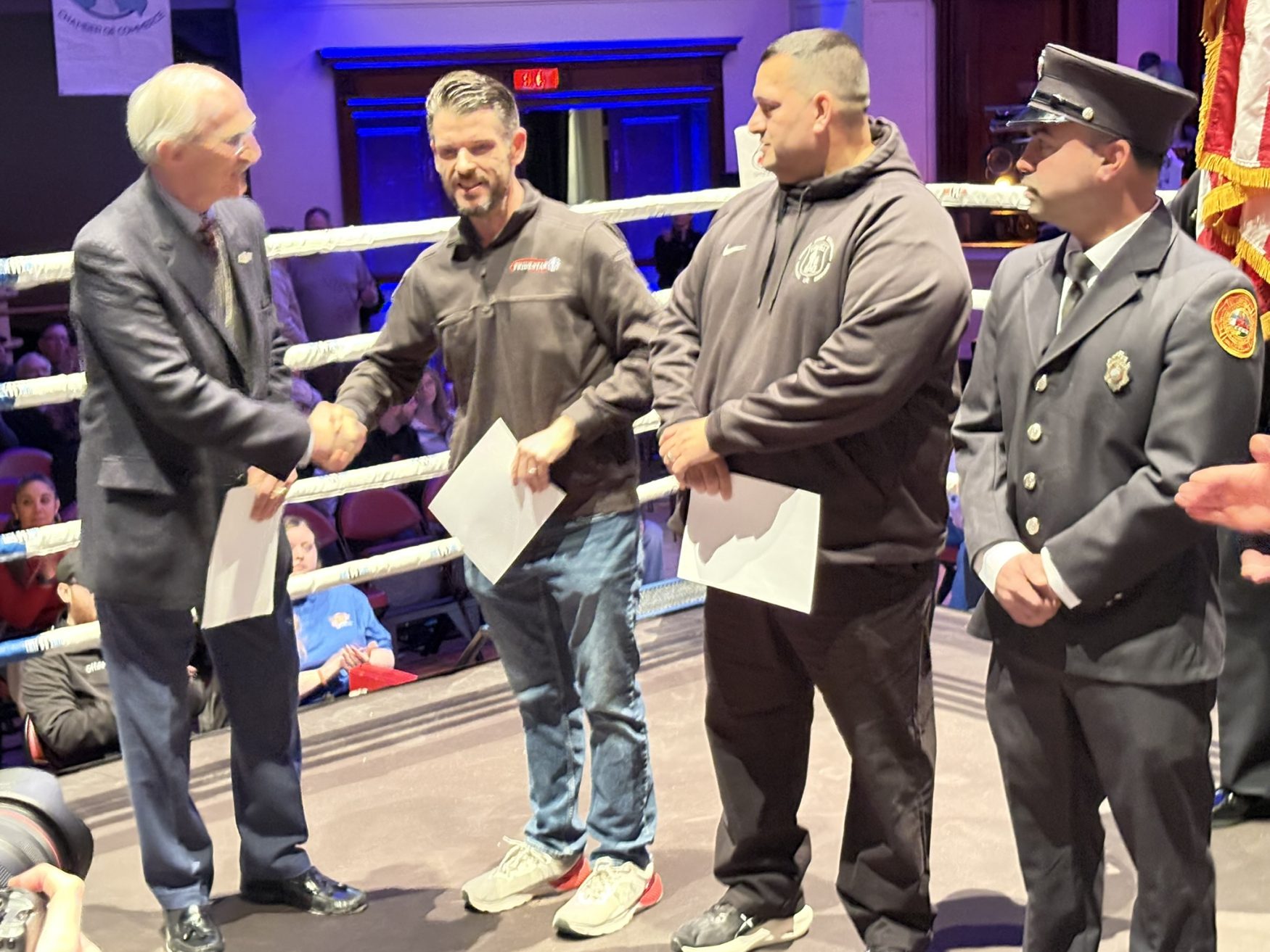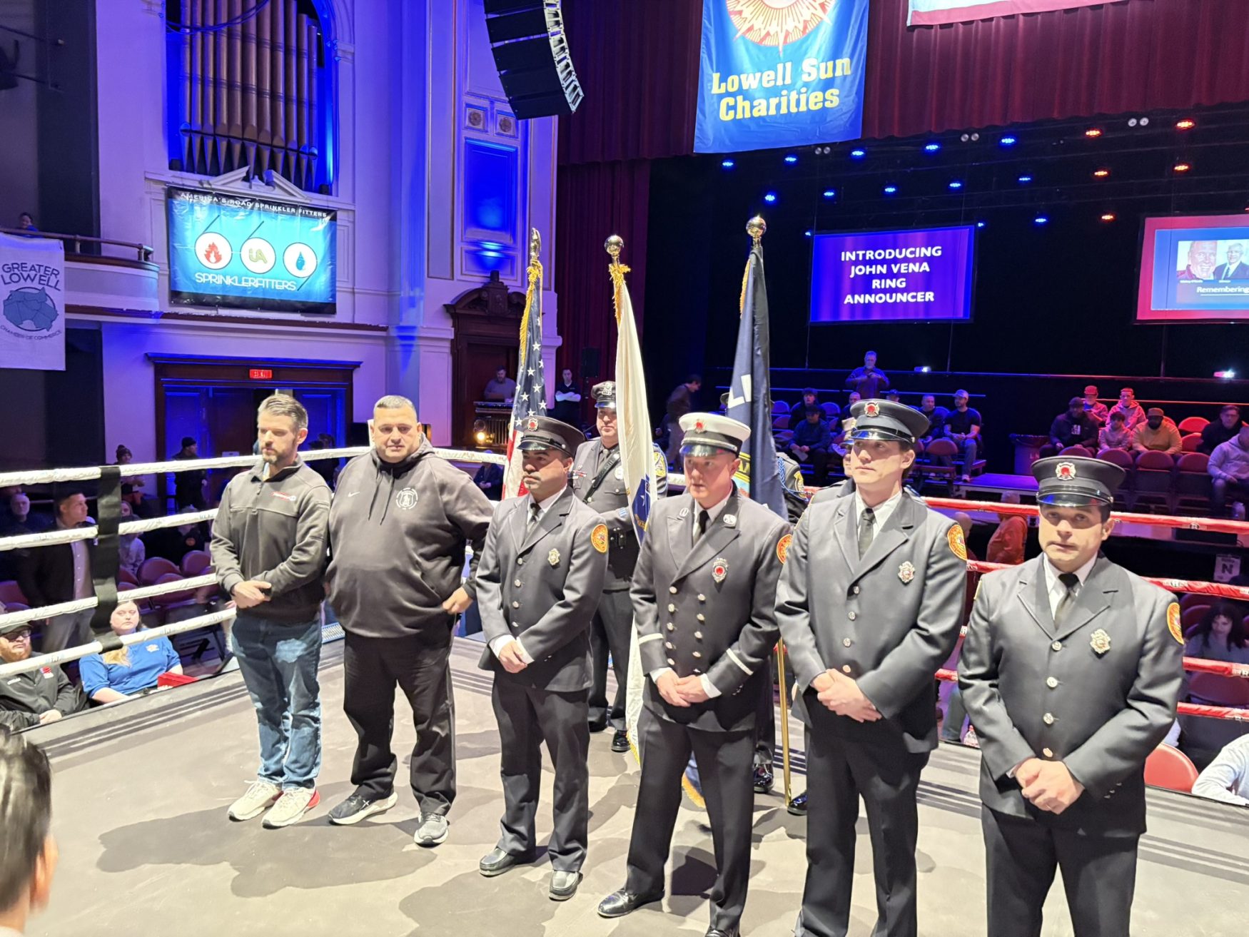 Recently Joe Breen, EMT/Dispatcher, was recognized at the Lowell Sun Charities 79th annual Golden Gloves boxing tournament being held at the Lowell Memorial Auditorium. Joe, surrounded by friends, family and fellow First Responders, was recognized along with members from the Lowell Police and Lowell Fire as a Local Community Champions.